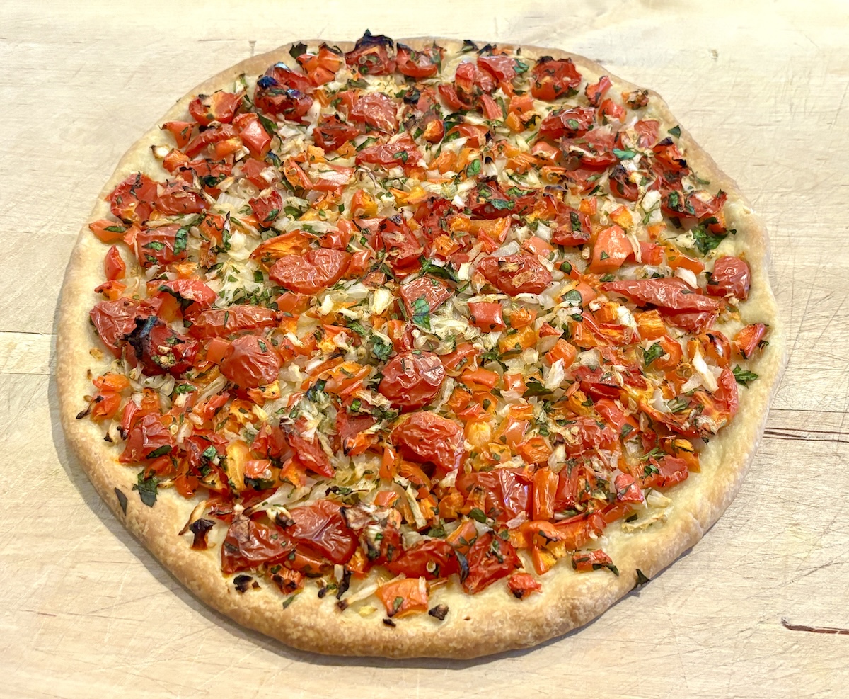 In the Balearic Islands, such as Mallorca, a similar dish is called "Coca de Trampò" (trempar in Mallorquin means "to dress"). Coca de Trampò usually features a topping made from a mix of vegetables such as onion, bell peppers, and tomatoes cut up and mixed with salt, pepper, and EVOO. After 15 minutes or so, the mixture is drained (to remove the excess water) and placed raw on the dough, which typically incorporates lard and EVOO for a crunchier crust result. We tried the Mallorquin version, replacing lard with EVOO, and using the following proportions: 1 cup flour; 3 Tbsp EVOO, 5 Tbsp water, 1/2 tsp yeast; 1/2 tsp salt. All can be cooked for about 30 minutes at 400F. It will make at least 2-3 people happy (see picture below of our round-shaped result).